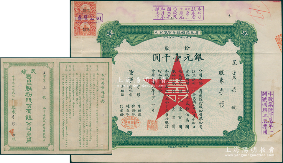民国八年(1919年)寿星面粉股份有限公司股票,拾股计银元壹千圆,其发行号码仅为“星字第7号”,票上股东即为董事李穆(曾任长芦盐运使),另董事杨味云亦曾任长芦盐运使、北洋财政次长等职(华新纺织创办人),且附原息单1份;此乃天津第一家机制面粉厂,至1925年改组为寿丰面粉公司;罕见且属首度公诸于阳明,八成新