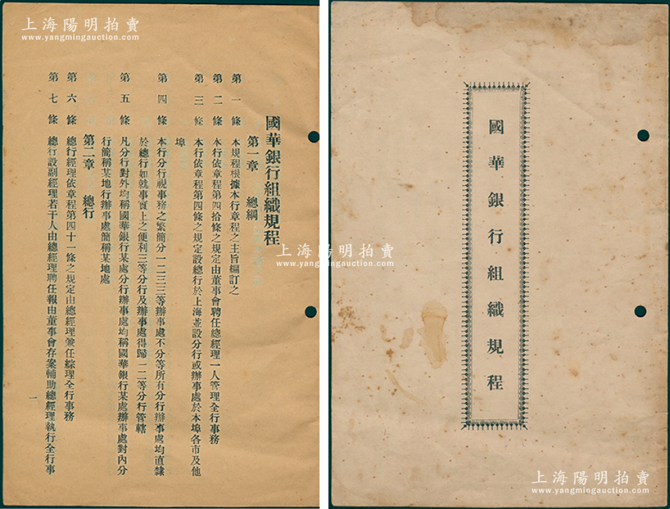 民国十九年(1930年)《国华银行组织规程》1册,内中详列各项规程五章共35条;该行属民国著名之商业银行,历史意义厚重,亦发行有老股票存世,保存较佳,敬请预览