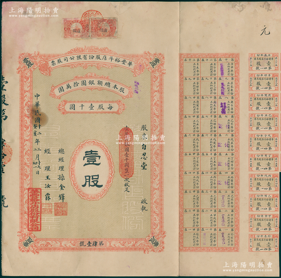 民国十二年(1923年)华丰裕斗店股份有限公司股票,壹股计银圆壹千圆;斗店即大粮行,旧时粮食零售业谓粮栈,主营批发和存储者谓斗店,交易以斗为计量单位,故名;天津老股票之罕见品,亦属首度公诸于阳明,近八成新