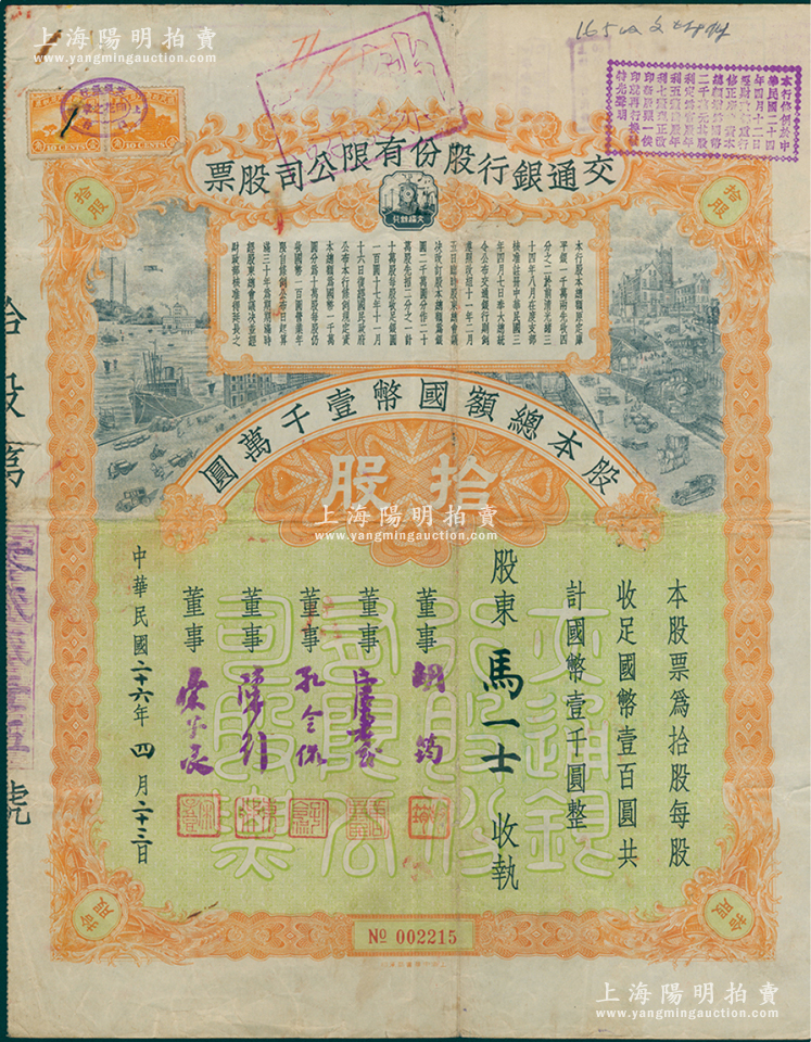 民国二十六年(1937年)交通银行股份有限公司股票,拾股计国币壹千圆,票上由董事胡筠、唐寿民、孔令侃(孔祥熙长子)、陈行、宋子良签名;此种签名版存世稀见,七五成新