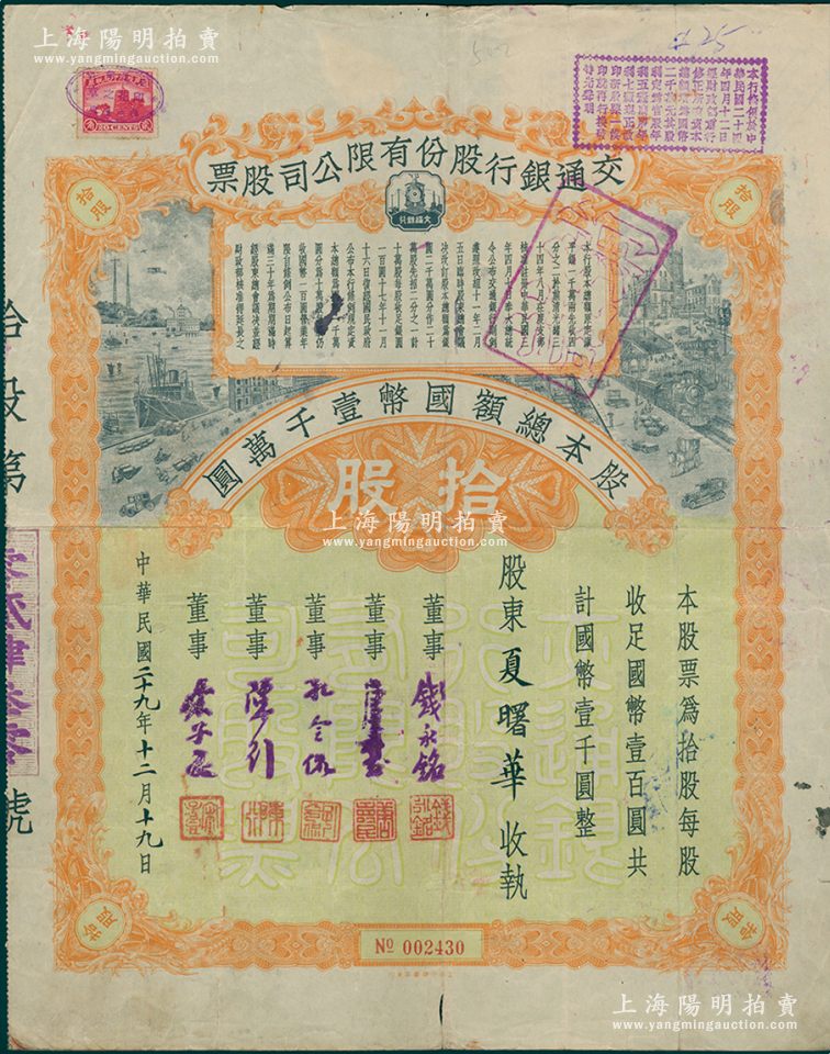 民国二十九年(1940年)交通银行股份有限公司股票,拾股计国币壹千圆,票上由董事钱永铭、唐寿民、孔令侃(孔祥熙长子)、陈行、宋子良签名,背面付息状况至1965年;此种签名版存世稀见,七五成新
