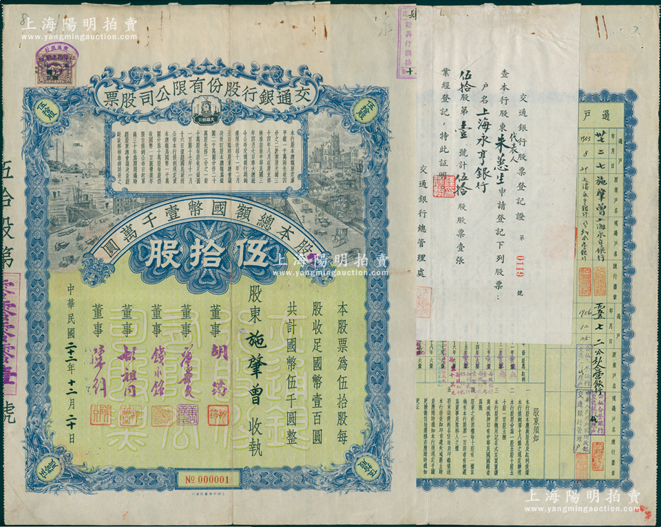民国二十二年(1933年)交通银行股份有限公司股票,伍拾股计国币伍千圆,其发行号码仅为“No.000001”号(天字第1号,尤为值得珍视),票上股东施肇曾乃近代著名外交家,由董事胡筠、唐寿民、钱永铭、胡祖同、陈行署名,背面记录至1948年过户给上海永亨银行等(该行董事长亦为施肇曾),附带有息票;珍罕,诚可遇而不可求也,八成新