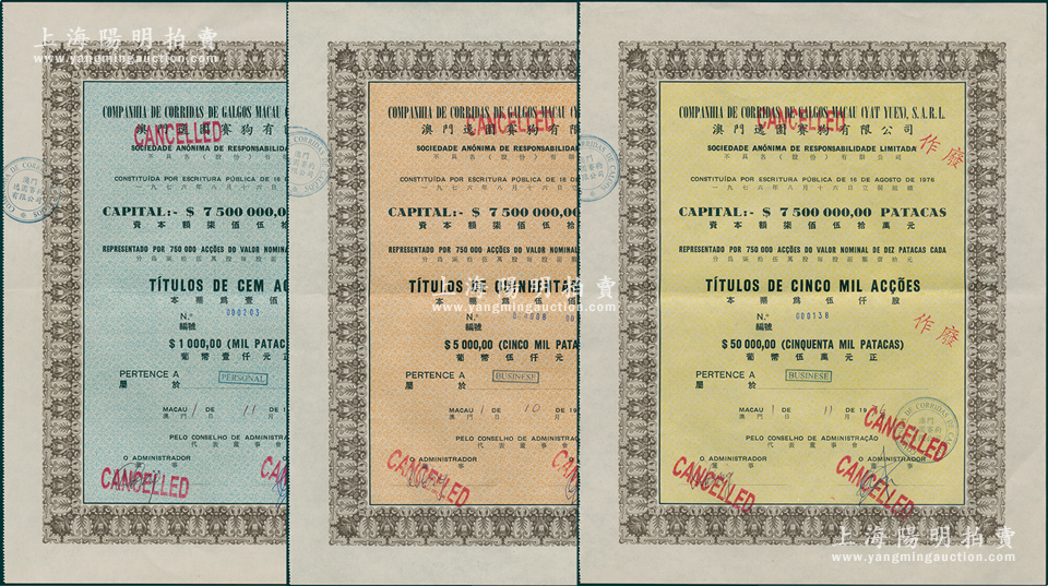 1976年澳门逸园赛狗有限公司股票共3种,详分:壹佰股计葡币壹仟元、伍佰股计葡币伍仟元(号码为第8号)、伍仟股计葡币伍万元;此乃目前亚洲唯一合法经营之赛狗场所,由民国之上海逸园运动场演变而来,几经变革,成为“赌王”何鸿燊旗下博彩产业之一;香港藏家出品,其中伍佰股存世稀见,近九成新