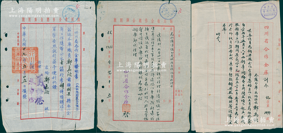 民国廿七年(1938年)四川省合作金库训令、证明书等共3件,均发给郑为欣氏,分别派任(证明)其为铜梁县库筹备主任,改支月薪五十元等情;四川省合作金库亦发行有老股票存世,是项拍品可作为老股票之辅助收藏;保存较佳,敬请预览