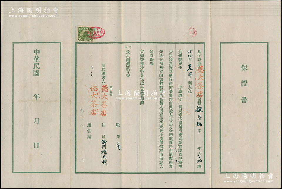 民国三十年(1941年)天津飞来福银号“保证书”共7份不同,均各职员之“铺保”,且具保人各不相同,少见,八成新