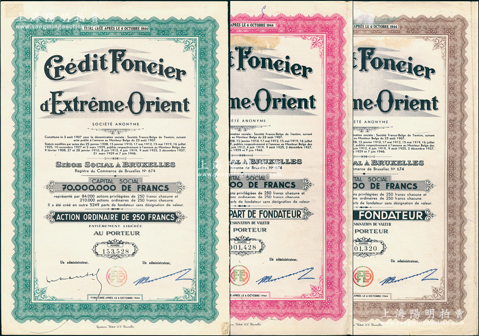 1944年(天津)义品放款银行股票共3种全套,详分:棕色发起人股250法郎、紫红色优先股250法郎,绿色普通股250法郎,票上均印有天津英文地名;此乃天津著名之外商银行,在上海、北京、汉口、香港等地亦设有分行,主要经营房地产押款等业务;海外藏家出品,成套者存世稀见,八至九成新
