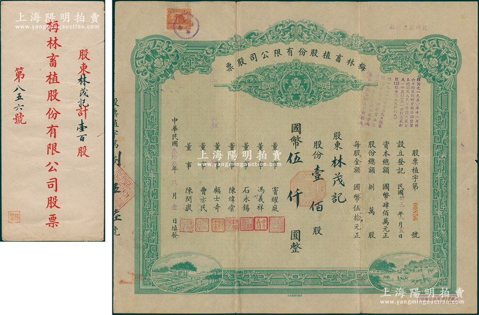 民国叁拾叁年(1944年)梅林畜植股份有限公司股票,壹佰股计国币伍仟圆,且附带原封套,票上董事窦耀庭乃上海滩著名地产商,投资广泛,曾出资与邵醉翁经营“笑舞台”,并聘请张石川担任顾问,其弟张巨川为前台经理,郑正秋为后台经理,促成中国电影业之伊始;八成新