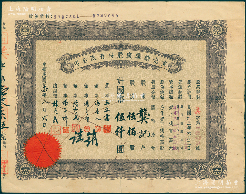 民国三十四年(1945年)美光染织厂股份有限公司股票,伍佰股计国币伍仟圆,票上由董事王尔藩(上海大中银行总经理)、蒋彦武(浙江兴业银行常务董事)等签名,七五成新
