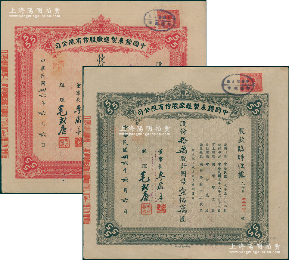 民国卅六年(1947年)中国钟表制造厂股份有限公司股款临时收据共2种不同,详分:壹万股计国币拾万圆、拾万股计国币壹佰万圆,票上董事长李康年氏为中国民族工业之杰出企业家;此乃著名民族企业之老股票,票上四角有“555”标志,即代表该厂所生产的驰名国内外的“三五牌闹钟”,八五成新