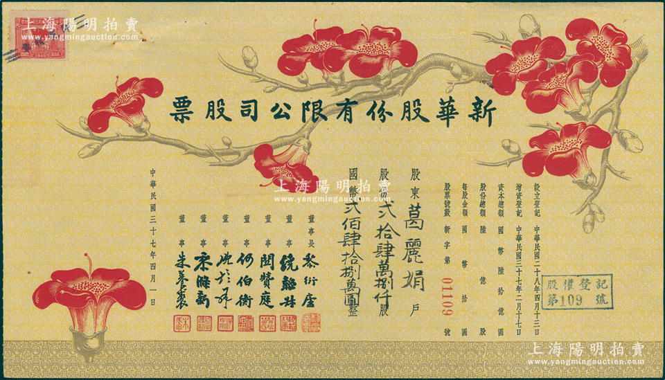 民国三十七年(1948年)新华股份有限公司股票,贰拾肆万捌仟股计国币贰佰肆拾捌万圆,上印梅花图甚是别致,少见,八成新