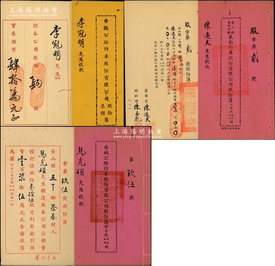 民国时期广东台山县车路公司股份簿共3册不同,详分:①1947年《台鹤公路行车股份有限公司股份、息摺簿》1册,由李冠明氏承购肆股计国币肆拾万元;②1947年《台山县台赤公路东南行车股份有限公司股份簿》1册,发行号码仅为“股字第2号”,由该公司董事长陈远大氏承购壹佰股计国币壹百元;③1948年《台瓶公路行车股份有限公司股份簿》1册,由马光硕氏承购叁拾伍股计国币壹百柒拾伍万元;此三册