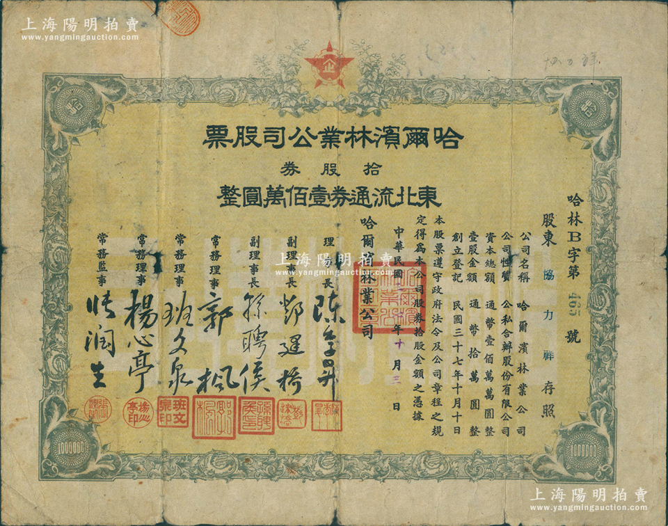 民国三十七年(1948年)哈尔滨林业公司股票,拾股券东北流通券壹佰万圆,东北解放区老股票,亦属最早期之公私合营股票,少见,七成新