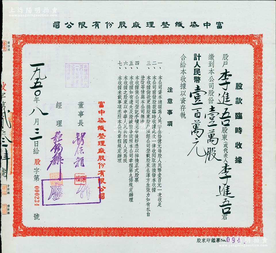 1950年富中染织整理厂股份有限公司股款临时收据,壹万股计人民币壹百万元,票上董事长钱保稚曾为百年老店“世泰盛”之经理,经理强锡麟乃上海纺织业巨子,少见,九成新