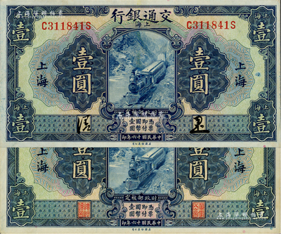 民国十六年(1927年)交通银行蓝色壹圆共2枚不同,上海地名,其职章处分别为“签名版”和“印章版”;美国藏家出品,九至九八成新