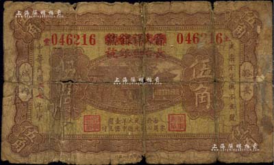 民国二七年(1938年)晋蚨祥银号改长治县银号伍角,属山西晋东南解放区纸币,少见,有裂痕及小贴痕,原票六成新(注:此种伍角券实物,共分1938年和1939年两种年份,值得钞友重视和区分!)