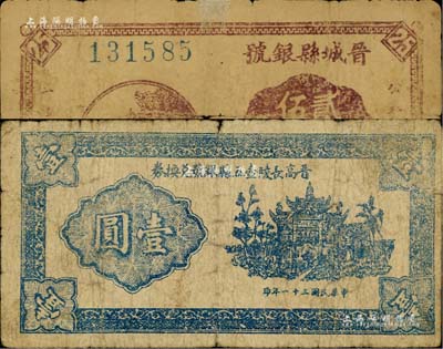 晋东南解放区纸币2种,详分:晋城县银号1940年贰角伍分、晋高长陵壶五县银号兑换券1942年壹圆,其中1枚有小修补,七成新