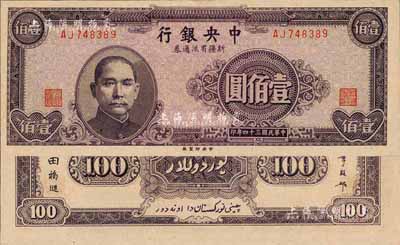 民国三十四年(1945年)中央银行新疆省流通券壹佰圆,央行纸币之大珍品;森本勇先生藏品,早年得自台北陈吉茂先生处,罕见,九八成新