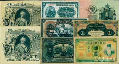 客钞及外钞共8枚,详分:明治四十四年版(1911年)朝鲜银行券拾圆;华俄道胜银行中东铁路券(1917年)50戈比、1卢布;沙俄帝国1909年25卢布、1910年100卢布2枚,1918年25、100卢布;以上各纸币,均曾在中国东北地区广泛流通,七至八成新,敬请预览