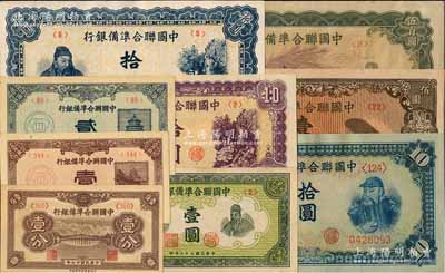 中国联合准备银行纸币9种,详分:1938年壹分、壹角、贰角,1944年壹圆;无年份版左大殿右关羽拾圆、蓝色左关羽右第一泉拾圆、紫色左关羽右第一泉拾圆、左楼阁右帝壹百圆、单凤伍百圆;前辈藏家出品,九五至全新
