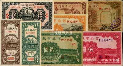 河北省钞8种,详分:河北银行1929年天津壹角;河北省银行1933年伍圆、1934年壹圆、贰圆、伍圆,天津地名;河北银钱局1936年贰拾枚,1938年肆枚、陆枚;白尔文先生藏品,其中1枚背有贴痕,六成至全新,敬请预览