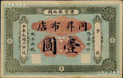 民国三年(1914年)同昇布店壹圆,直隶肃宁县民间钞票,背印五色旗图,少见,八五成新