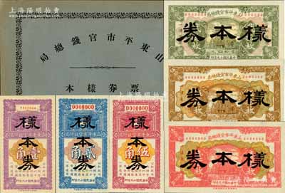 《山东平市官钱总局票券样本》1册,内含:民国十九年(1930年)山东平市官钱总局铜元票贰拾枚、伍拾枚、壹百枚样本券1套,辅币券壹角、贰角、伍角样本券1套,正背共12枚;此二套纸币均存世珍罕,堪称中国省银行纸币之一大精品,诚可遇而不可求也;源于日本名家森本勇先生之旧藏,全新